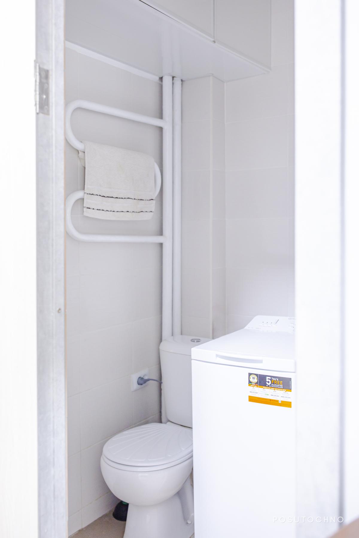Ванна кімната оформлена у білому та кремовому кольорах плитки. Усередині розташовані: ванна, туалет, умивальник із дзеркалом, сушарка для рушників та пральна машина.