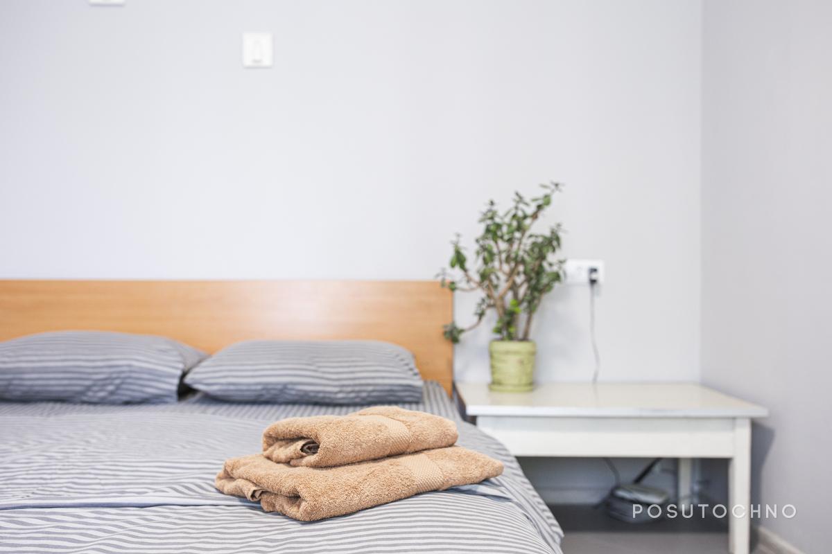Кімната оформлена в пастельному відтінку сірого кольору з акцентною стіною, на якій зображені білі стебла бамбука. У зоні спальні розташоване двоспальне ліжко з ортопедичним матрацом і невеликий столик. У зоні відпочинку — акуратний диван (розкладний), кілька м’яких стільців, обідній стіл зі стільцями, а для приємного дозвілля встановлено телевізор.