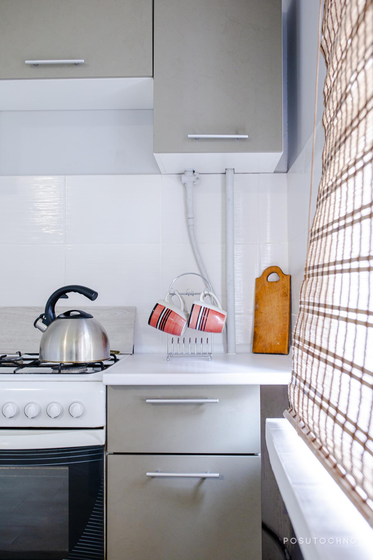 Кухонний гарнітур виконаний у бежевому кольорі, стільниця — біла. Є вся необхідна побутова техніка: холодильник, плита, духовка та чайник.