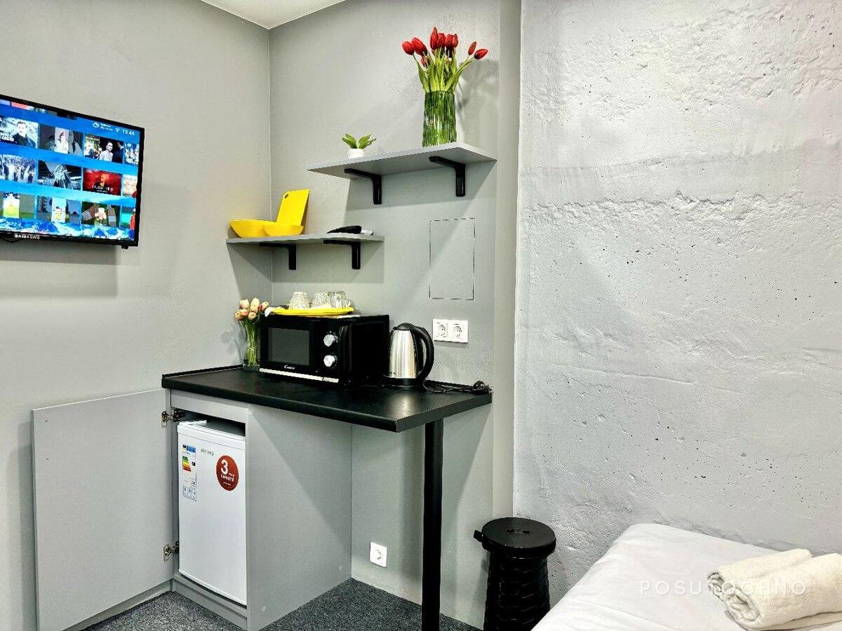 Компактна зона кухні має: невелику робочу поверхню з раковиною, шафою, холодильником, чайником і посудом.