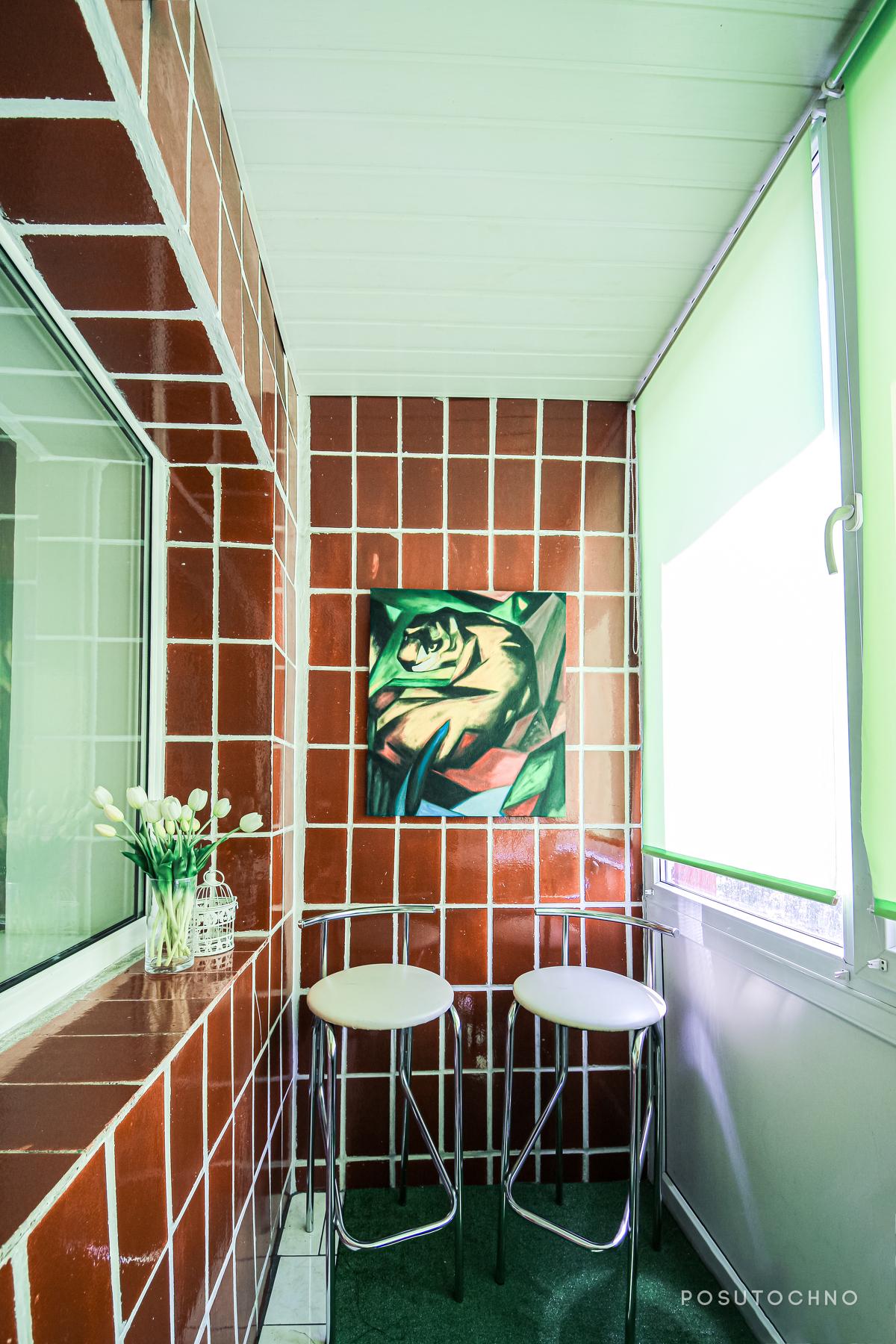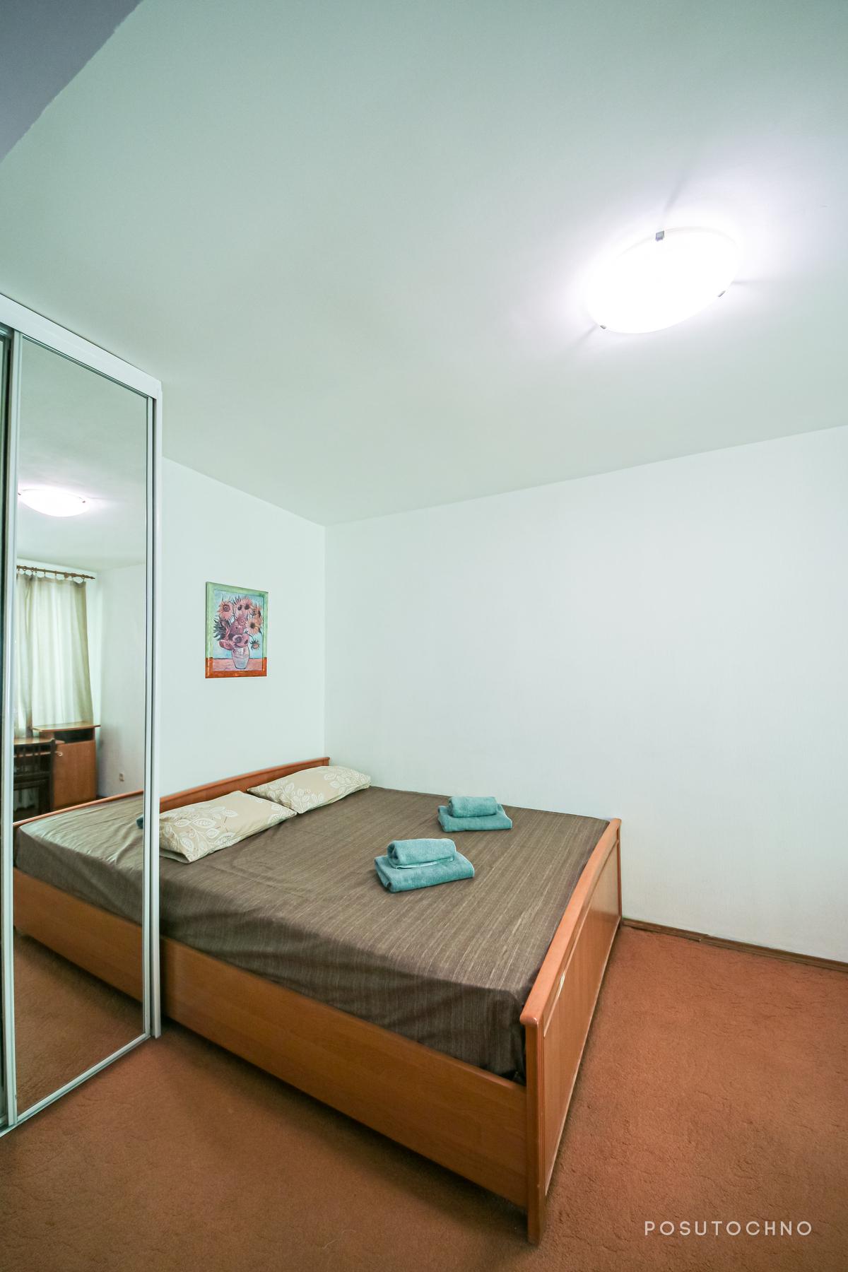 Спальня оформлена в світло-голубий колір, а також саме зі спальні розташований вихід на балкон. В спальні надані необхідні меблі для комфортного відпочинку, а саме: двоспальне ліжко, робочий стіл зі стільцем, дзеркальна шафа-купе. На балконі розміщені два високі стільця.