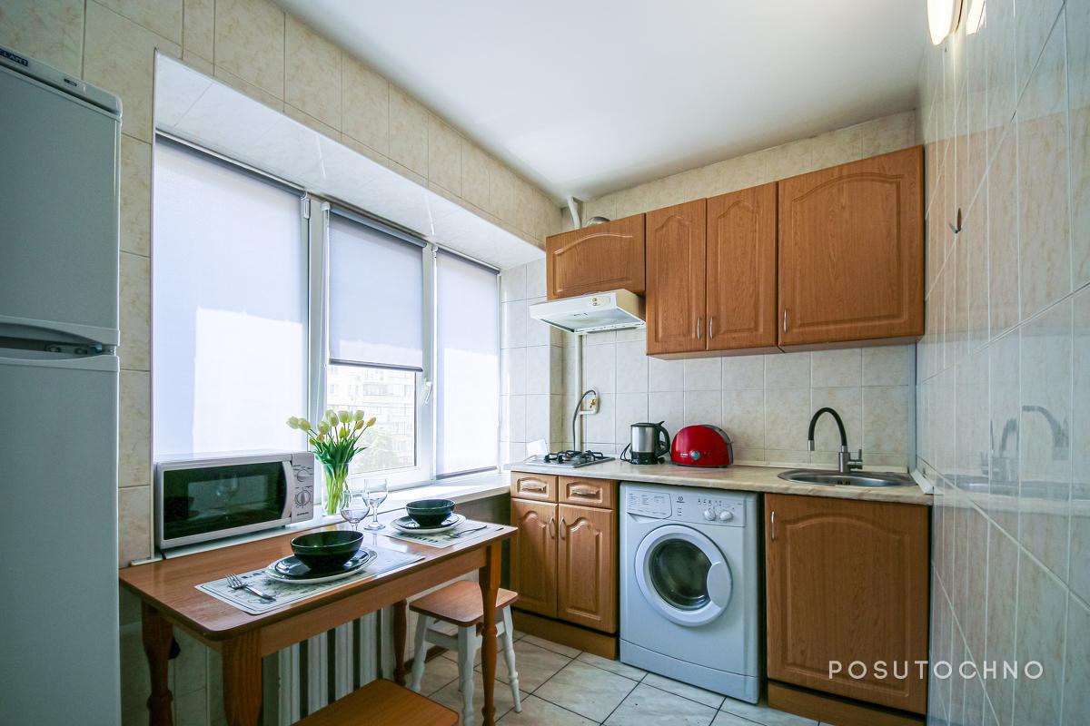 Кухня оформлена в біло-бежеву плитку, а кухонний гарнітур виконаний в світло-коричневому дереві. Тут розміщена невелика обідня зона та є всі необхідні побутові прилади, для комфортного проживання: газова плита, витяжка, холодильник, мікрохвильова піч та чайник.