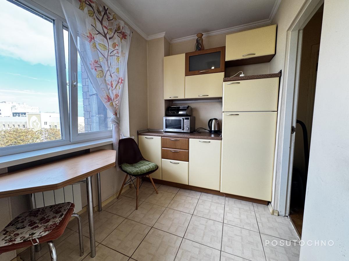 Кухня невелика, проте затишна, виконана в пісочному кольорі. В наявності є вся побутова техніка та меблі: холодильник, плита, витяжка, мікрохвильова піч, чайник та обідній стіл зі стільцями.