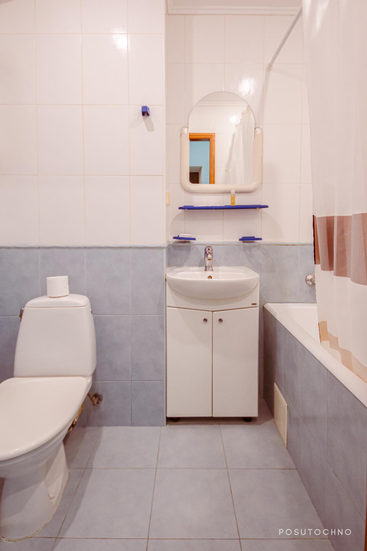 Ванна: ванна, туалет, умивальник, тумбочка та дзеркало з підвісною поличкою.