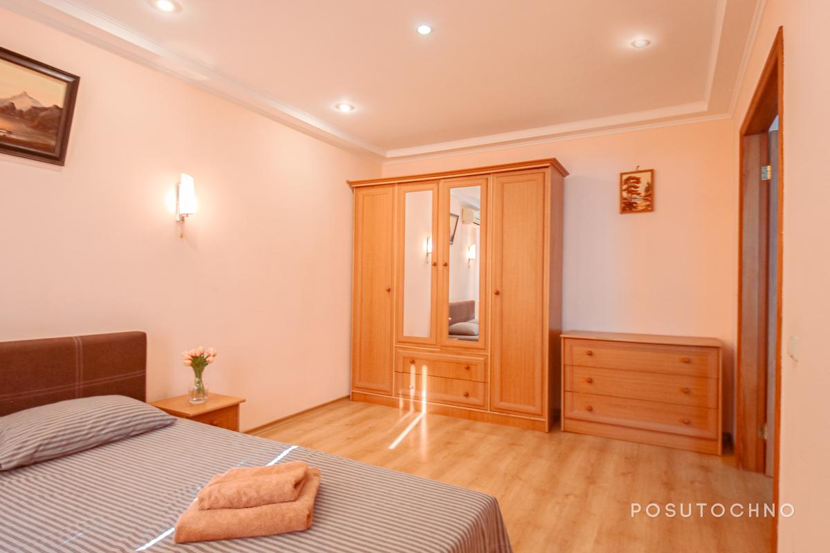 Спальня оформлена в теплий персиковий колір з великою кількістю дерев'яних меблів. Усередині є все для приємного відпочинку: двоспальне ліжко з ортопедичним матрацом, тумбочки, бра над ліжком, комод з дзеркалом і шафа-стінка для розміщення речей.