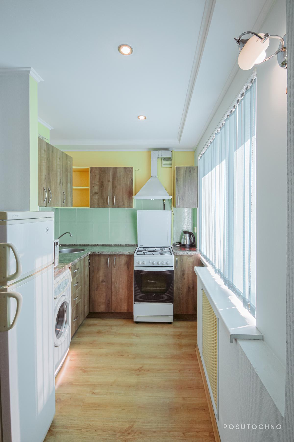 Зона кухні знаходиться в невеликому заглибленні, виконана в приємних відтінках жовтого та зеленого, з деревним гарнітуром. У кухні є все необхідне для комфортного проживання: кухонна стінка з вбудованою раковиною, чайник, плита, духовка, витяжка, мікрохвильова піч, холодильник і холодильник.