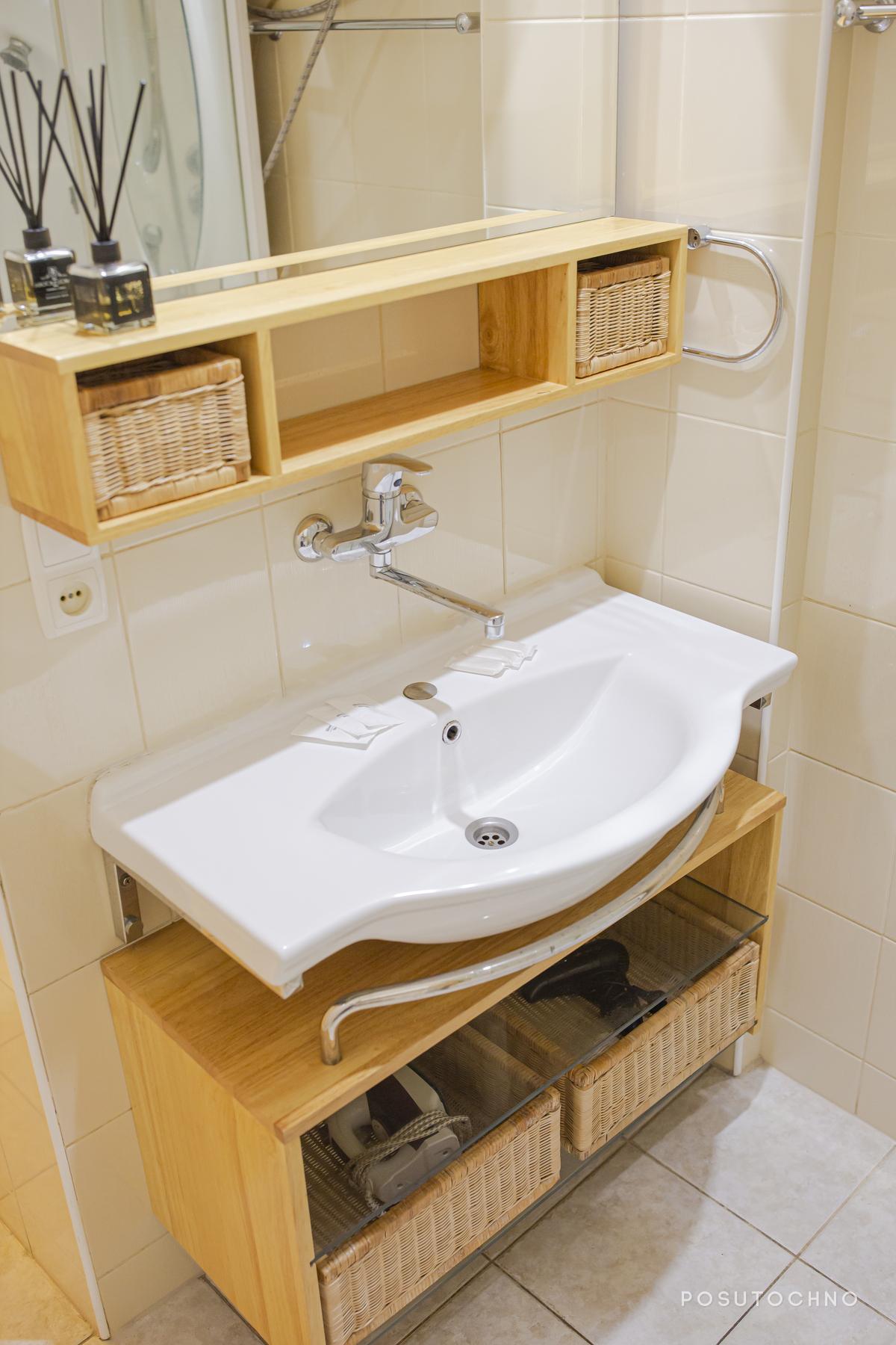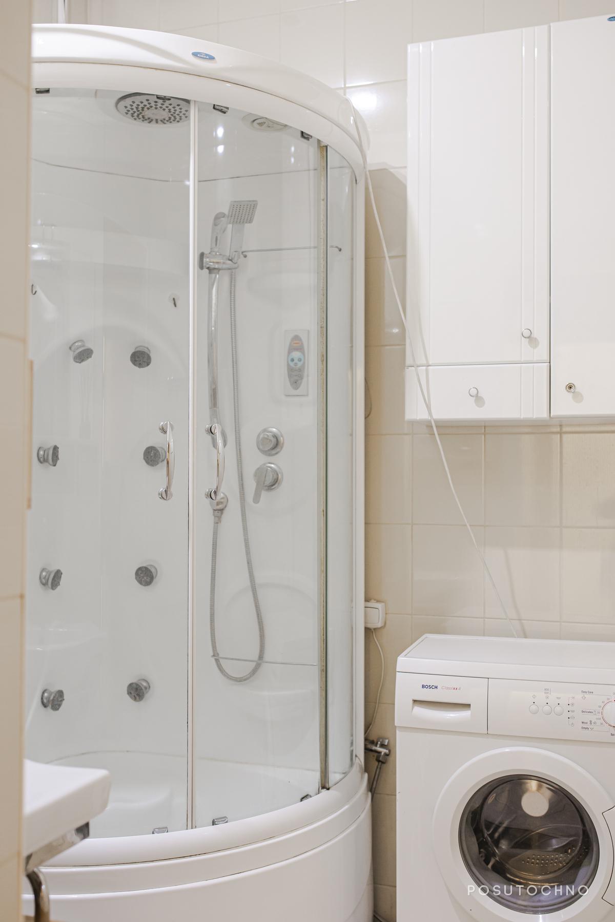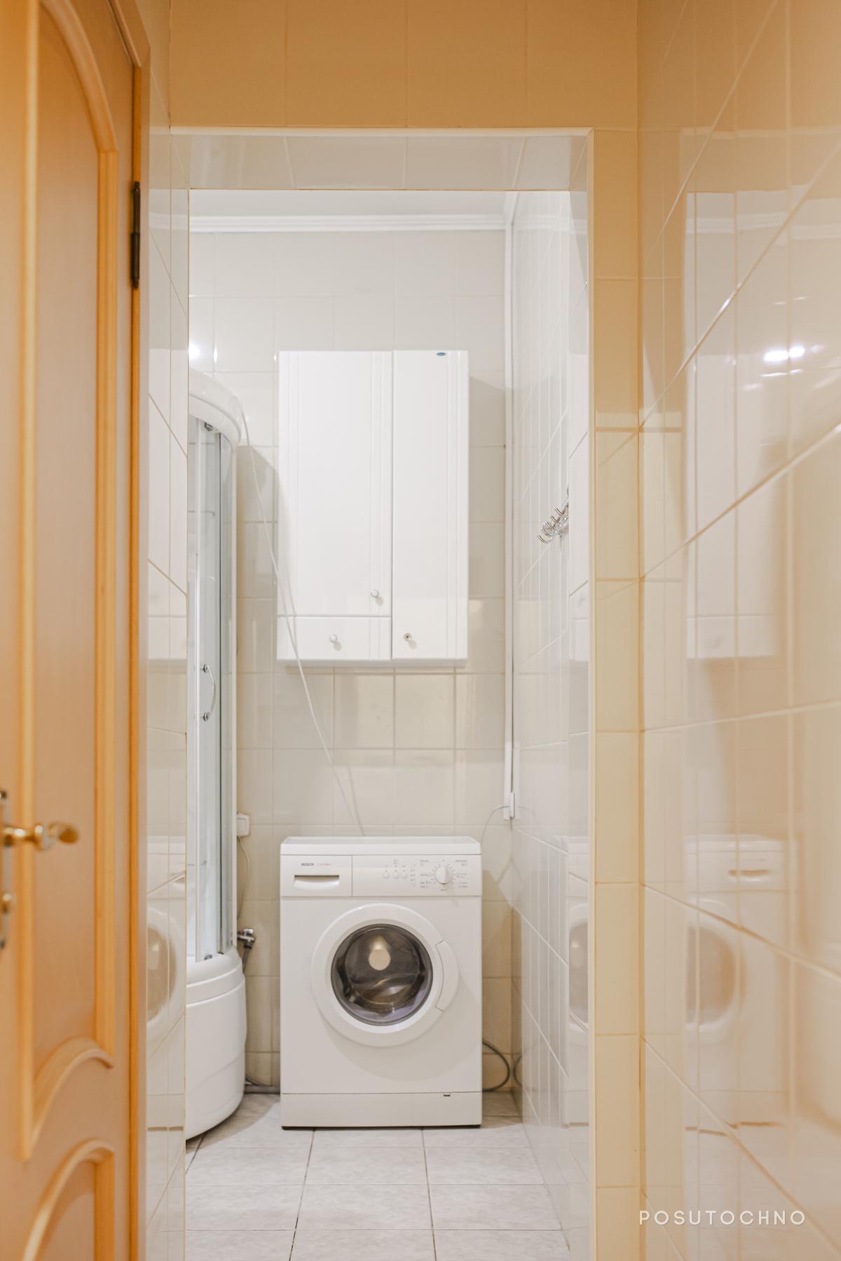 Ванна кімната та окрема вбиральня виконані у кремовому кольорі. У ванній кімнаті встановлені: душова кабіна, тумбочка підвісна дзеркало з невеликими поличками, пральна машина і фен.