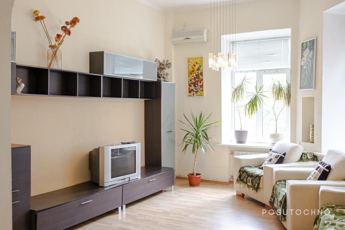 Вітальня простора з великими вікнами, виконана в кремовому відтінку. Усередині розташовані всі необхідні меблі та техніка для комфортного проведення дозвілля. А саме: меблева стінка в темному дереві, диван (розкладний) та 2 крісла в єдиній стилістиці, а також телевізор та кондиціонер.