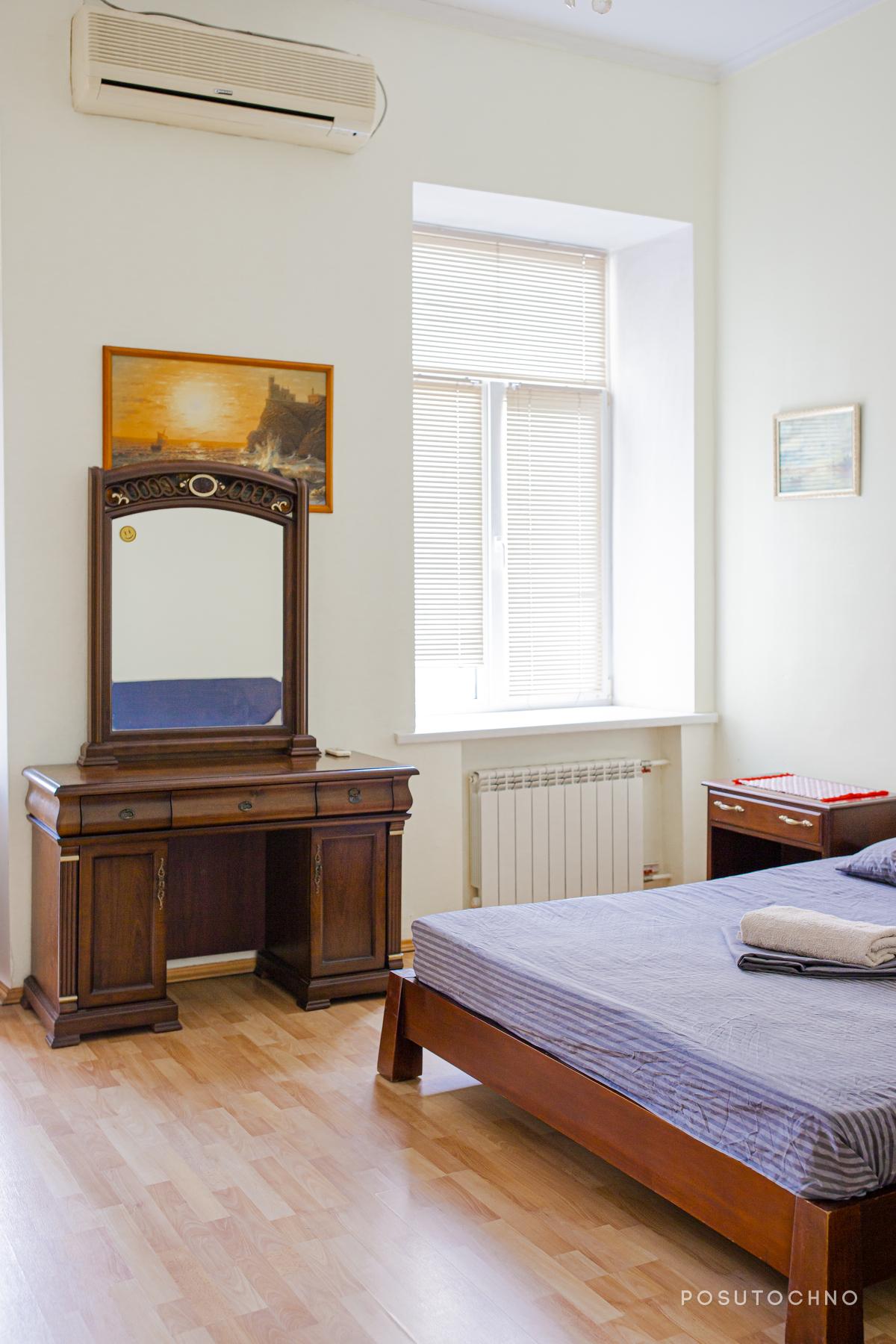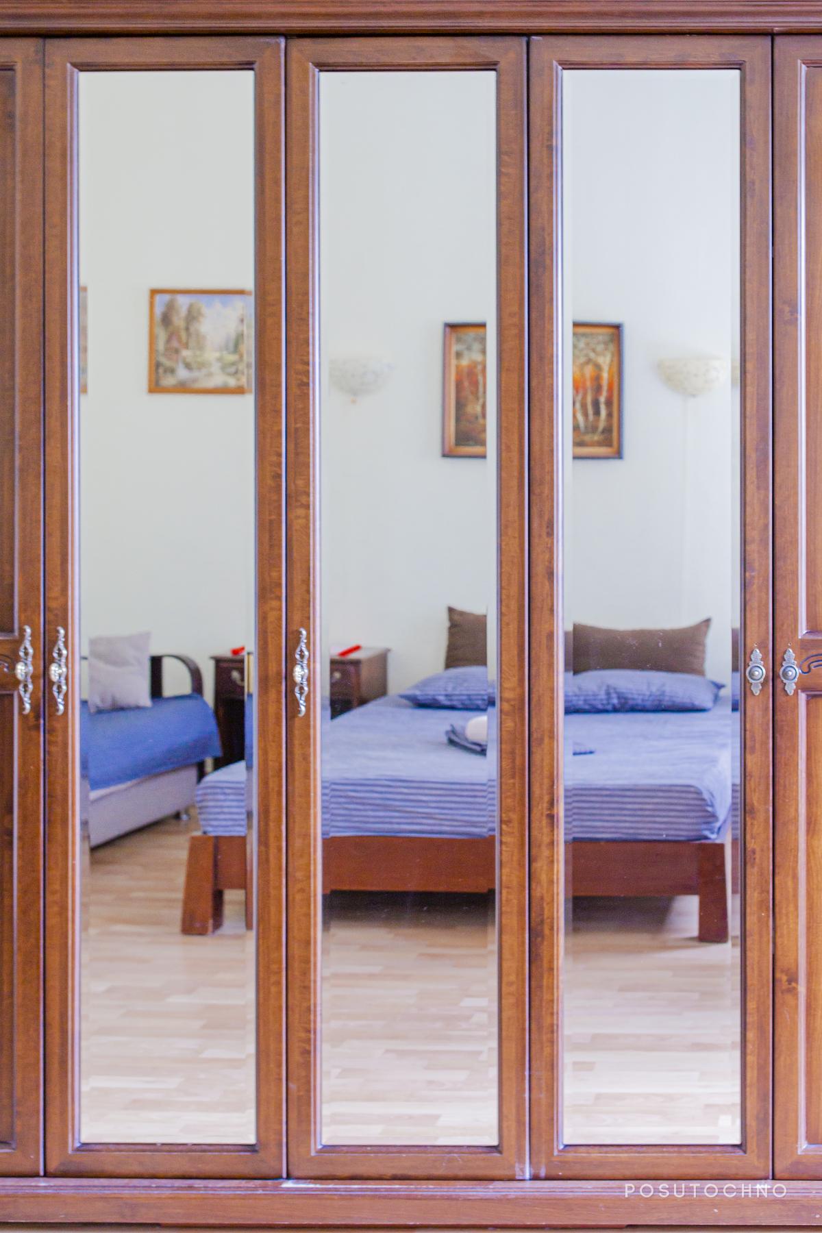 Перша спальня оформлена у світлих кольорах, який дуже освіжає. Усередині розташовані всі необхідні меблі для приємного відпочинку: ліжко двоспальне з ортопедичним матрацом, тумбочки, велика шафа з дзеркалами і туалетний столик.