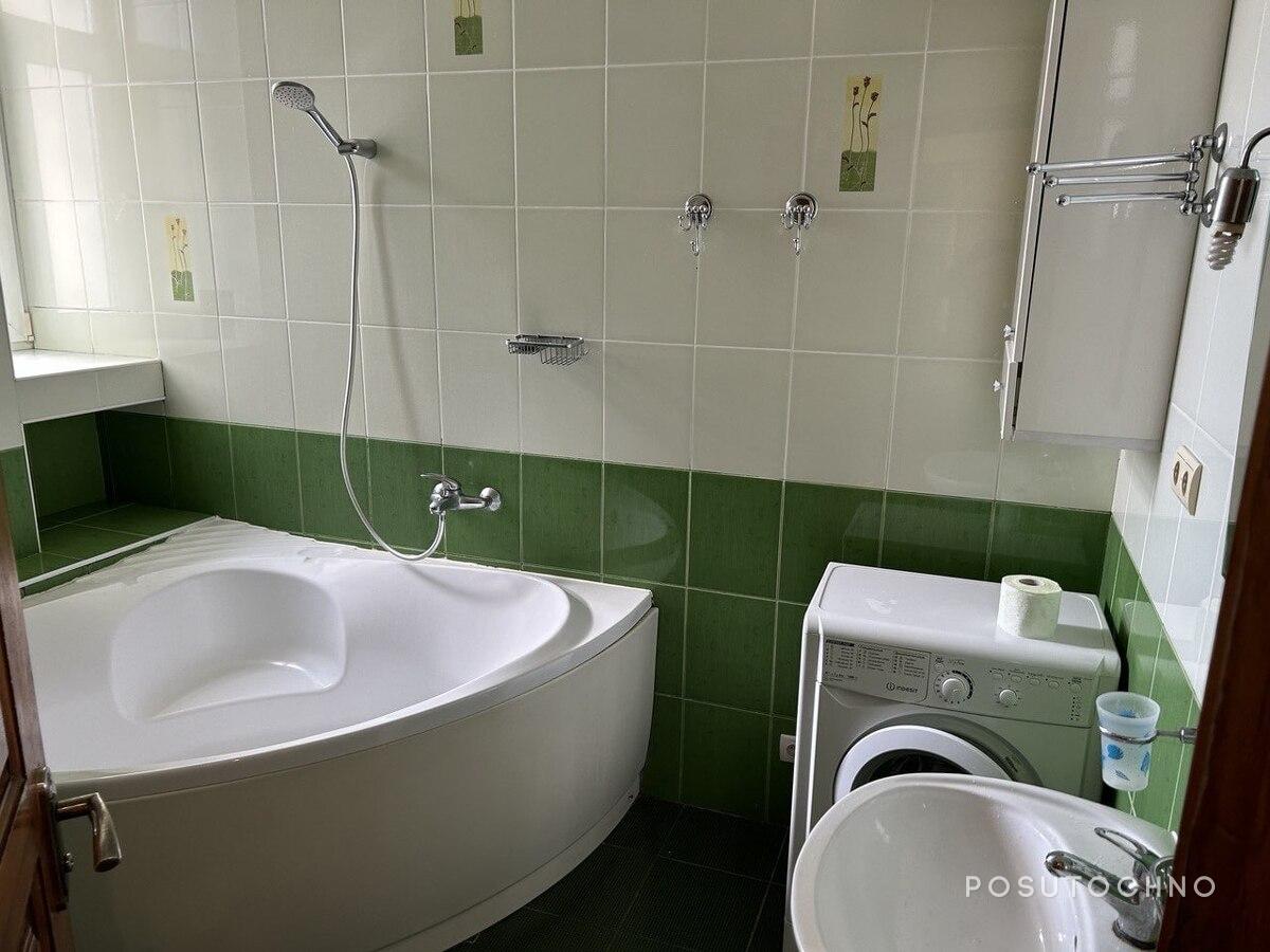 Не залишилася без вікон і ванна кімната. Тут є зручна ванна, просторий умивальник із дзеркалом, туалет та пральна машина.