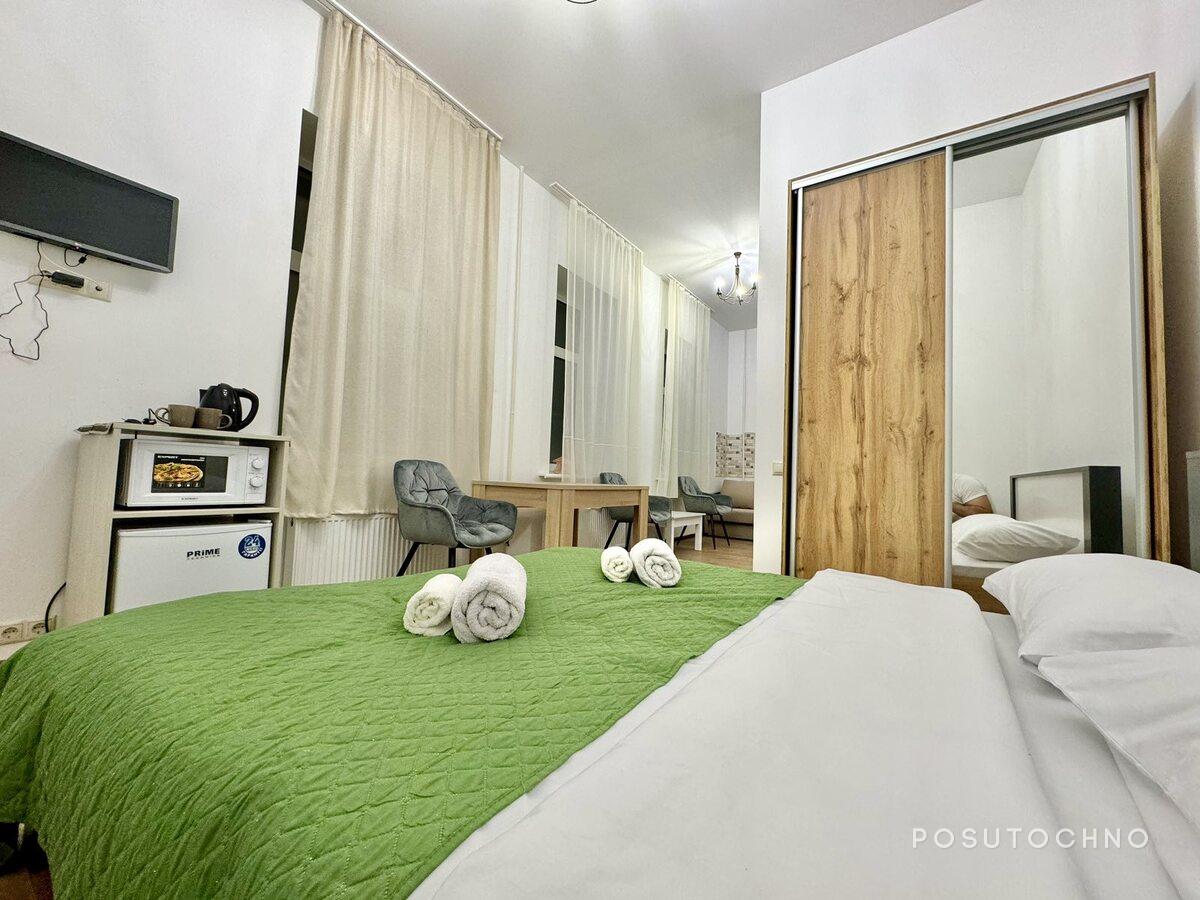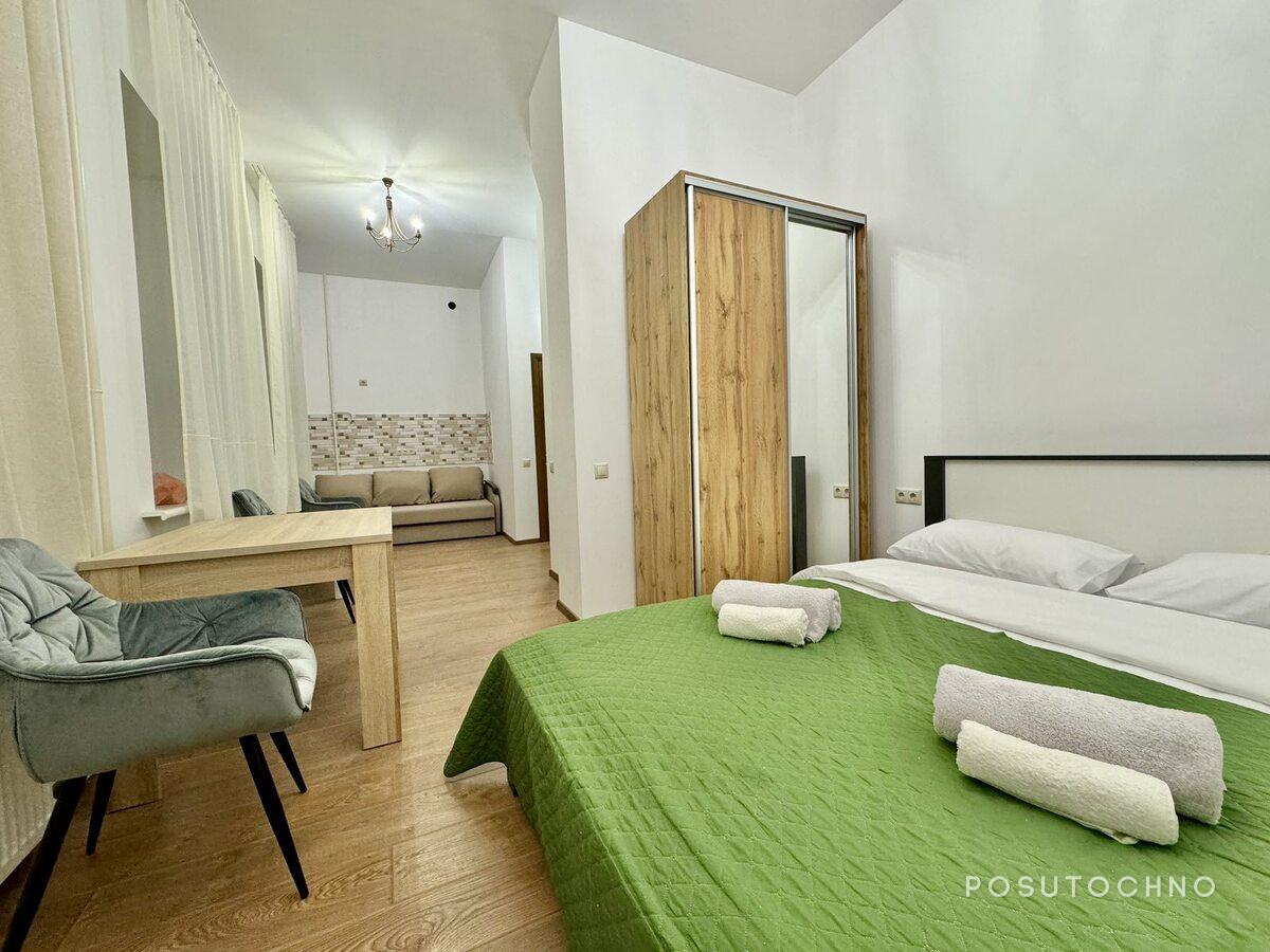 У зоні спальні надані всі необхідні меблі та техніка для комфортного відпочинку: двоспальне ліжко з ортопедичним матрацом, зручний диван, журнальний столик, телевізором.