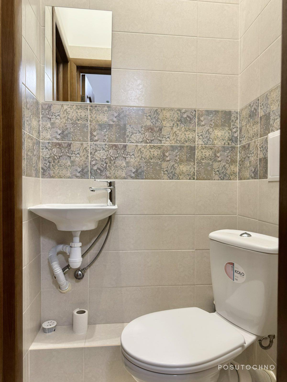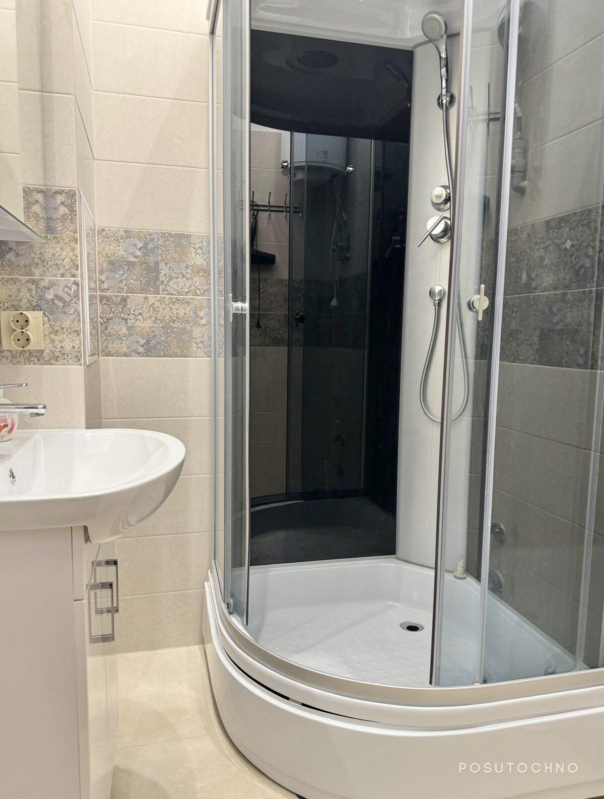 Вбиральня поєднана з душовою кабіною, є умивальник із дзеркалом.